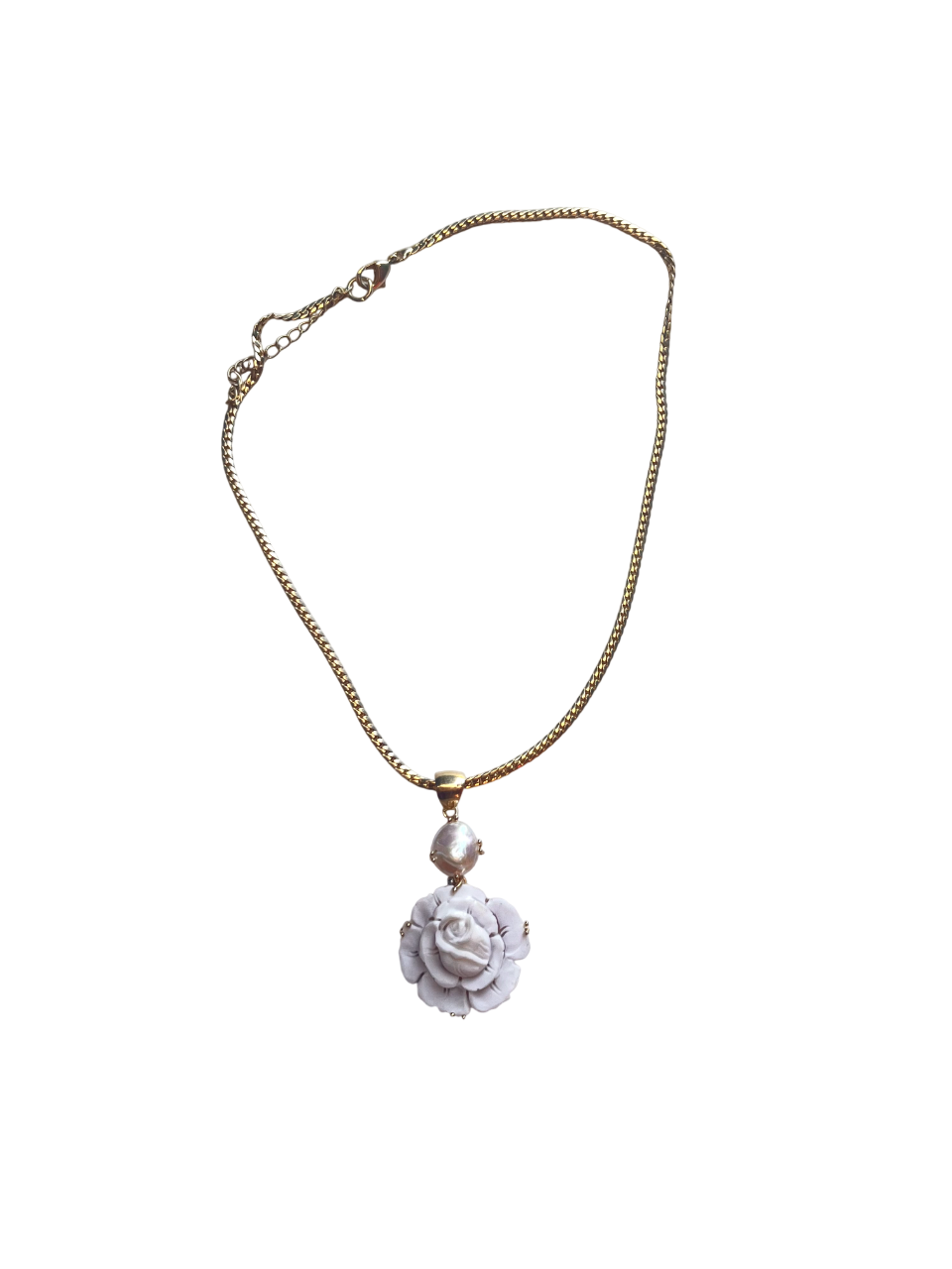 Una sottile ed elegante maglia piatta placcata oro 18kt incornicia il cammeo tridimensionale raffigurante una rosa. Ogni petalo è scolpito individualmente sulla conchiglia sardonica, creando giochi di ombre e profondità che rendono il fiore quasi realistico. La montatura a griffe in argento valorizza la perla naturale e il cammeo.