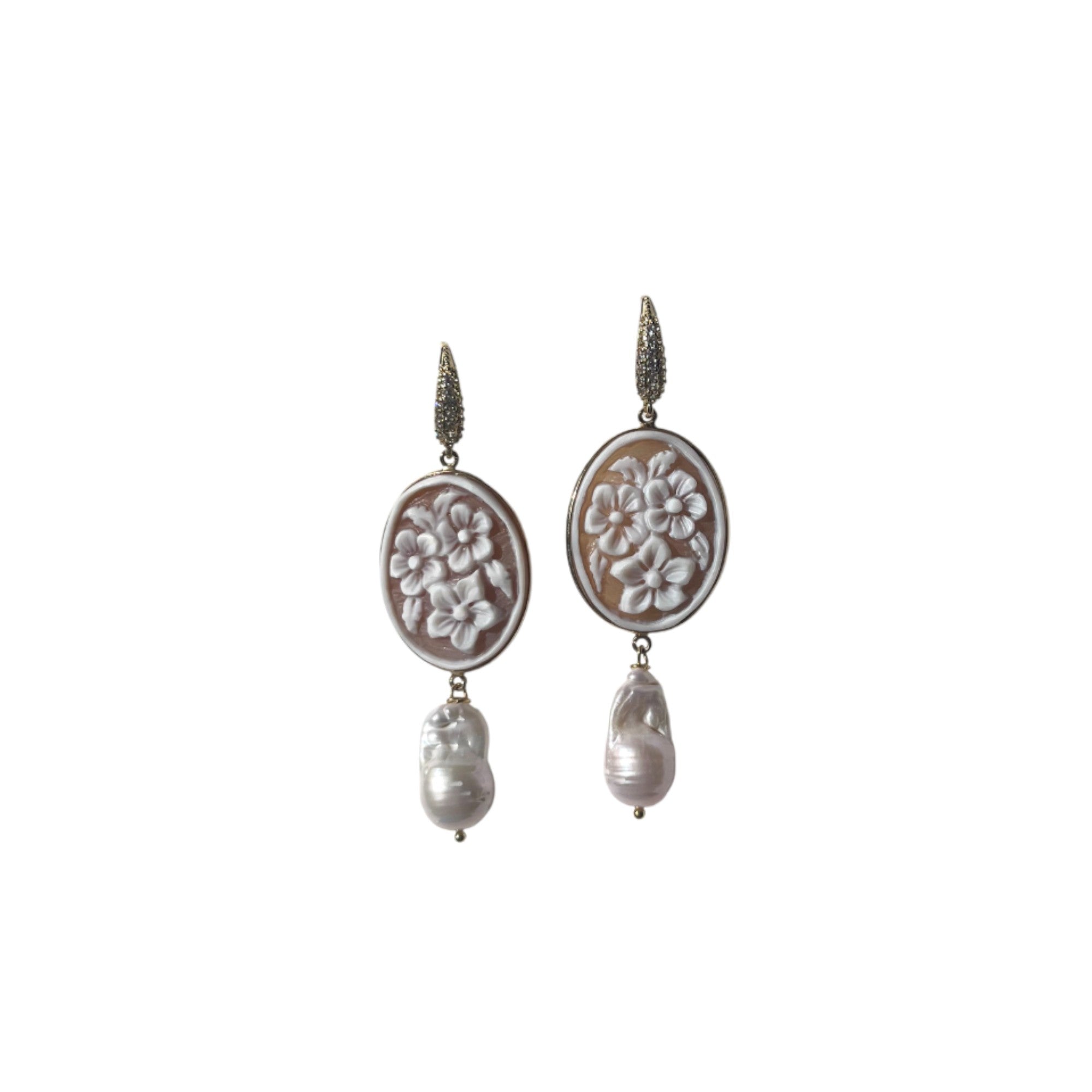 Questi orecchini sono composti da cammei ovali incisi su conchiglia sardonica, ciascuno rifinito da una montatura a cerniera in argento 925. La montatura è sostenuta da un perno ad amo placcato oro 18 kt, impreziosito da piccoli punti luce. Alla base di ogni cammeo dondola una perla naturale che dona un tocco di movimento al gioiello.