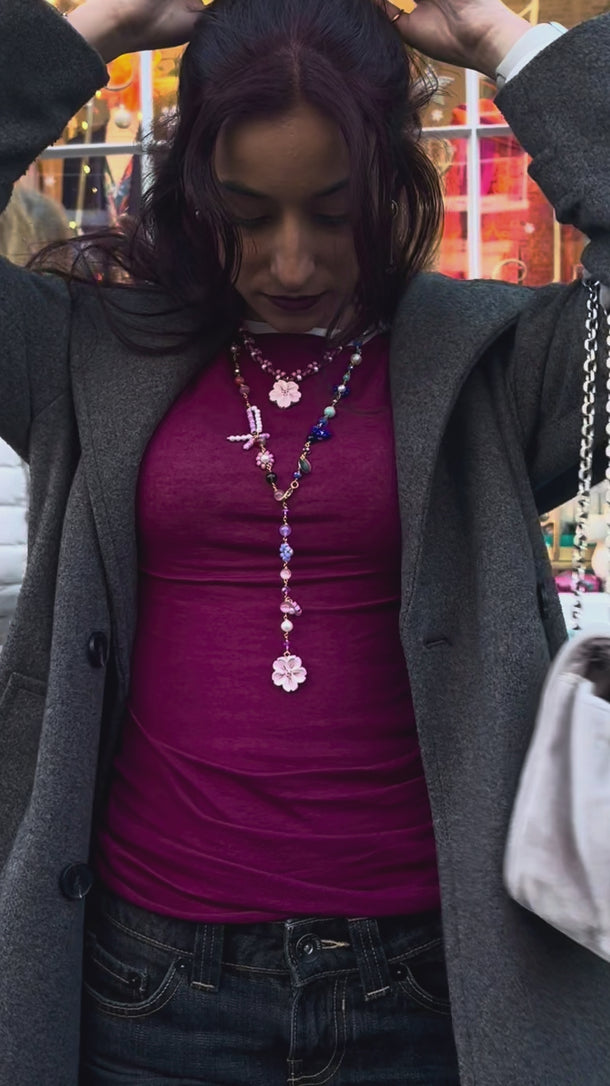 La bellezza della collana Sakura è esaltata dalla tecnica degli scoubidou, una lavorazione artigianale realizzata con filo di cotone cerato e impreziosita da perline Miyuki. A completare la finezza del design, troviamo il ciondolo in ceramica, modellato e dipinto interamente a mano.